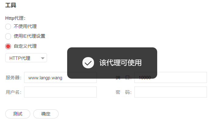 然后点击测试按钮,如果配置无误,那么就会提示“该代理可以使用”