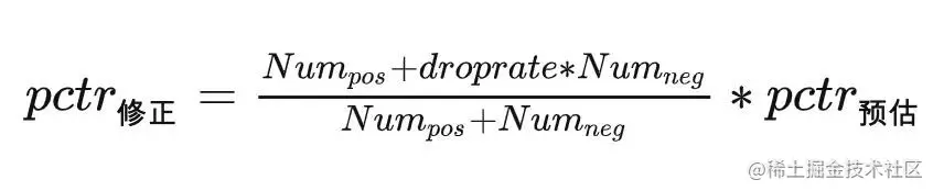 在我们场景上,目前是通过随机丢弃负样本的方式来实现采样的。采样后训练的模型预估出来的 pctr 与真实后验点击率 CTR 是有偏差的,所以线上使用预估分 pctr 时需要先用如下转换公式进行修正,然后在排序时使用。除了采样外,另外一个可以尝试的解法是在训练时通过对不同样本的 Loss 进行调权,也可以缓解类别不均衡带来的影响,不过调权任务比较繁重,可能一时很难调到理想的效果,预估分也难以还原。