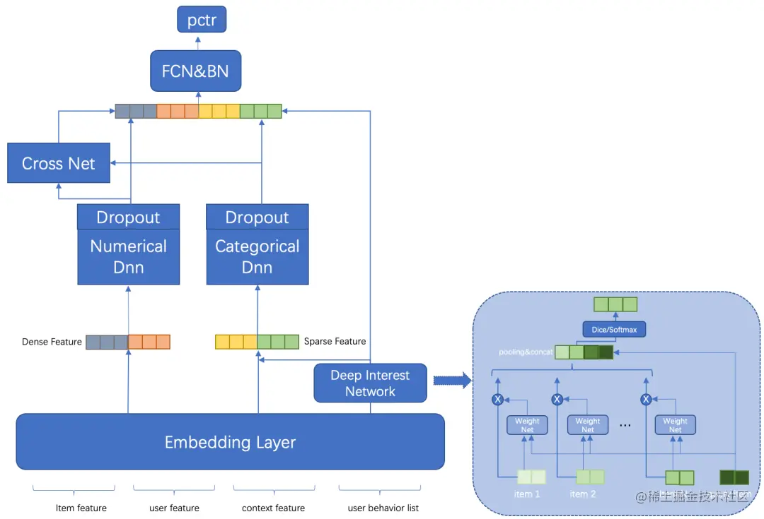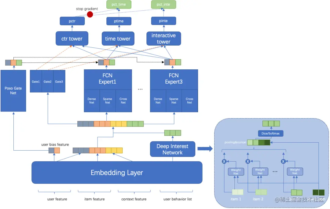 第一阶段是早期时候,只对用户点击率建模,精排层只有 CTR 模型。期间经过几次迭代,从开始的 DeepFM 结构,到结合业务特点的 DLRM 结构,特征交叉能力明显提升,以及增加了提取用户深度兴趣的 DIN 模块,都取得了不错的收益。