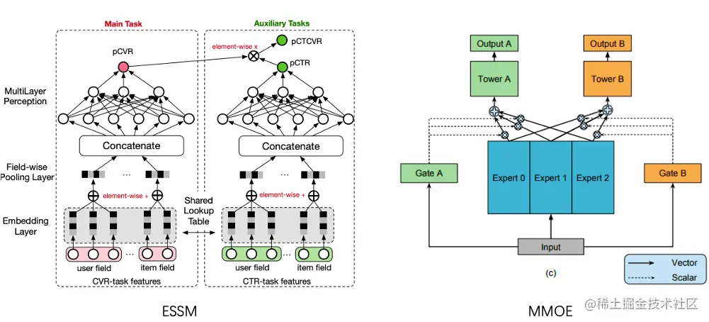 相比单个目标建模,对多个业务目标进行建模会遇到更多的挑战,其中比较常见的问题就是多个指标之间会有跷跷板现象。为了缓解这些问题,在业界经过多年的实践和技术发展,积累不少的优秀模型 ESSM、MMOE、PLE 和 ESCM 等等,其中比较重要和应用广泛的模型是 ESSM、MMOE,它们在很多业务场景都有着不错的效果,在得物社区场景,对多目标的建模也借鉴了相关模型的思路。