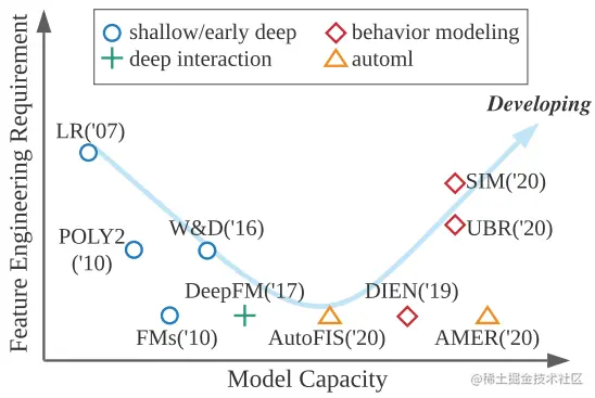 单目标的 CTR 模型的技术演进可从两个不同的视角进行观察,一个维度是特征工程,另外一个维度就是模型结构复杂度。在 CTR 模型早期的时候,受限于计算资源,模型结构往往比较简单,初期应用最广泛的便是 LR 模型。这个阶段算法工程师更多的时间是人工设计特征,从而针对不同的业务背景进行迭代拿到指标收益。