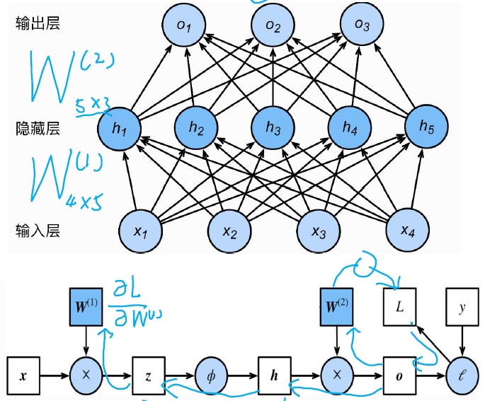 \begin{array}{l} \mathrm{z}=\mathrm{x} \cdot \mathrm{W}^{(1)} \\ \mathrm{h}=\phi(\mathrm{z}) \\ \mathrm{O}=\mathrm{h} \cdot \mathrm{W}^{(2)} \end{array}反向传播