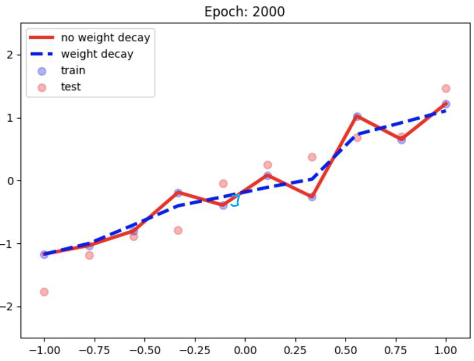 0<\lambda<1,看更关注Loss还是更关注正则项的一个调节系数。通过有无正则项的对比,可以看出L2正则化确实起到了衰减权值的作用。