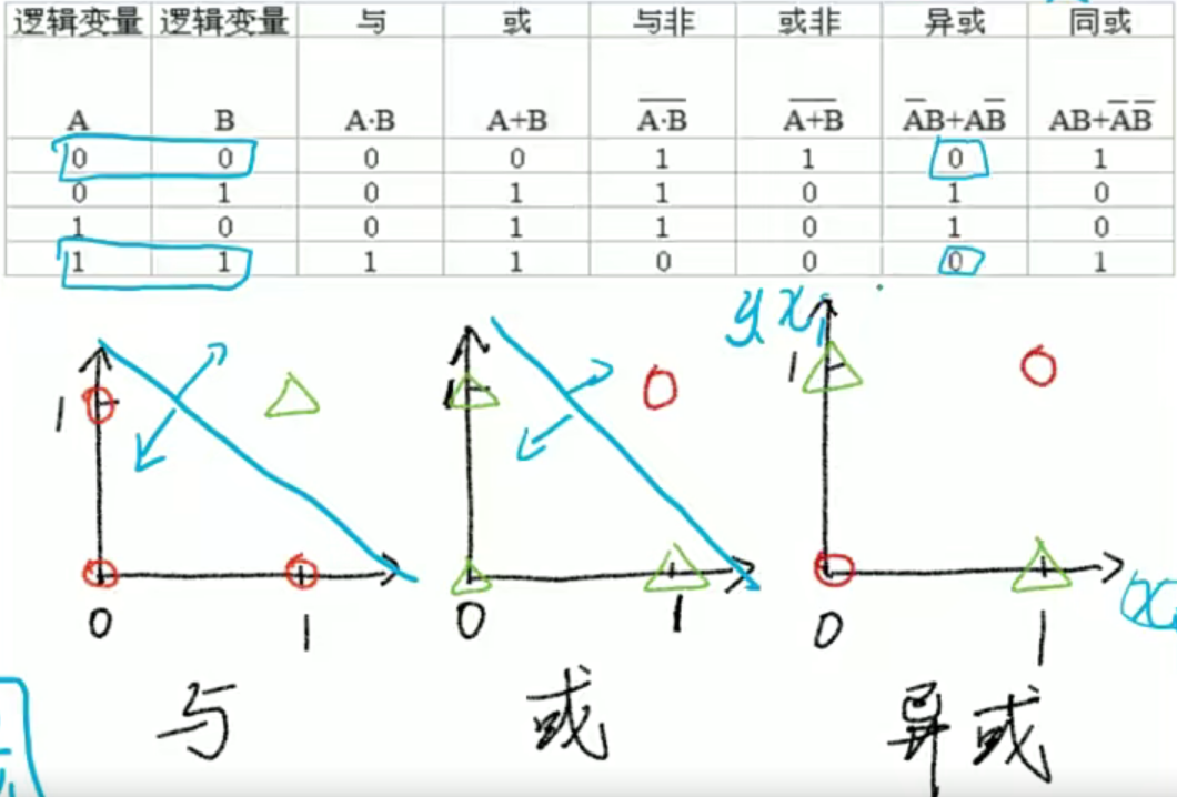 o=\sigma(\langle\mathbf{w},\mathbf{x}\rangle+b)\sigma(x)=\{\begin{array}{ll} 1 & \text { if } x>0 \\ 0 & \text { otherwise } \end{array}引发了第一波神经网络的热潮,但感知机的致命缺点是:Minsky在1969年证明Perceptron无法解决异或问题。根源在于,二维层面上神经网络是一条直线。无法划分异或的区间。