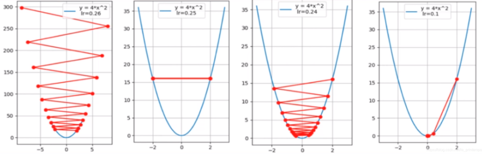 \boldsymbol{w}_{\mathrm{i}+1}=\boldsymbol{w}_{\mathrm{i}}- LR * \boldsymbol{g}(\boldsymbol{w}_{\mathrm{i}})不同学习率的影响:分别为1——0.25——0.24——0.1