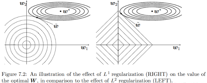 两个权值w1和w2组成的权值等高线,在所有等高线中选择L2正则化最小的(即圆与椭圆相切),L1正则化最小的(即方框与椭圆相切)。
