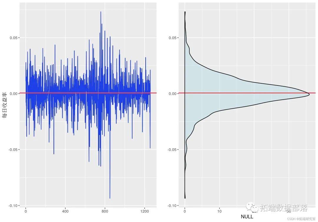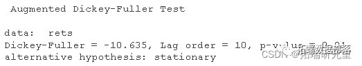 为了验证收益率的平稳性,我们使用了 Dickey-Fuller 检验,其中零假设表示非平稳时间序列。