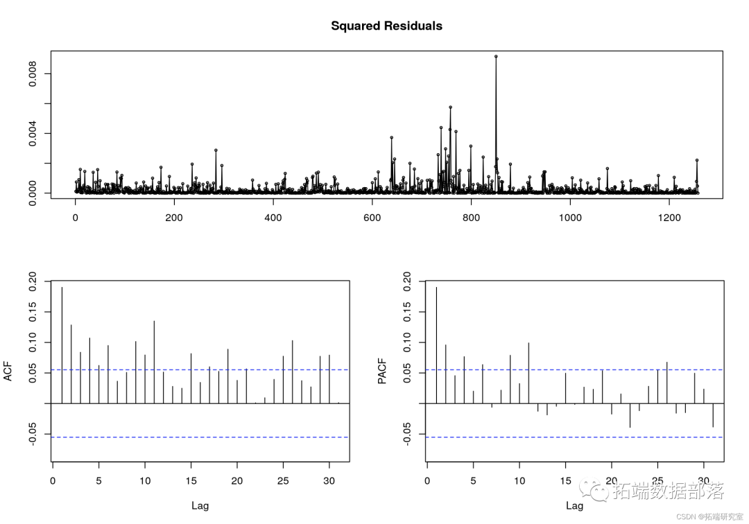 当残差平方相关时,GARCH 过程有效。ACF 和 PACF 图清楚地表明显着相关性。