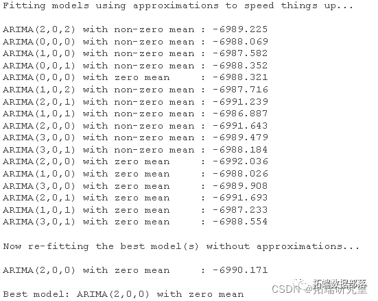 可以通过上面的过程观察到我们计算了各种 ARIMA 模型的 AIC ,并且我们推断出合适的模型是 二阶自回归 (AR(2))。