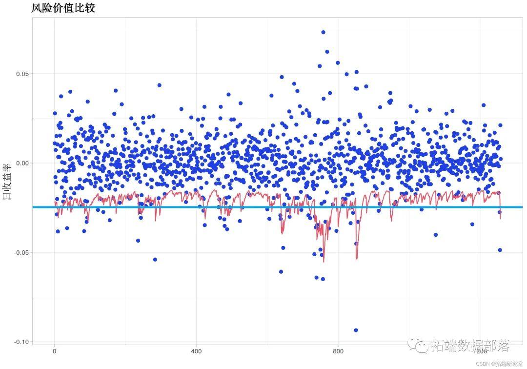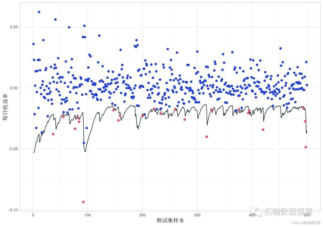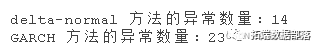 黑线代表 GARCH 模型给出的每日预测 VaR,红点代表低于 VaR 的收益率。最后一步是计算异常的数量,并将其与使用 delta-normal 方法生成的异常进行比较。