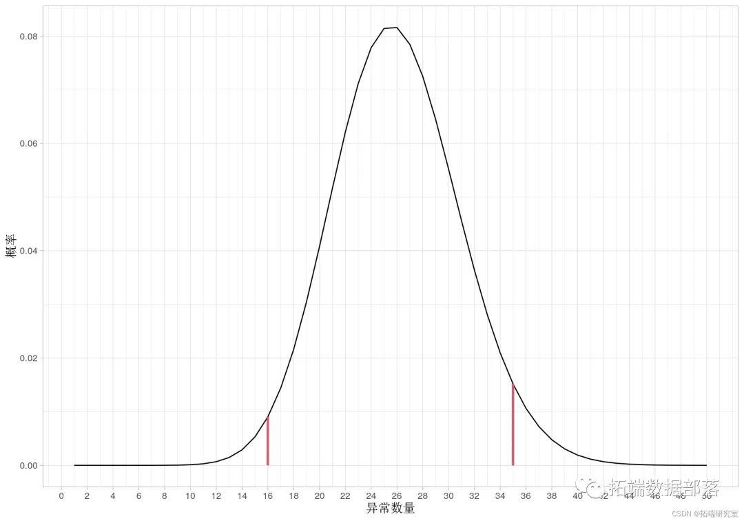 上图表示由二项式分布给出的异常概率分布。预期数量为 25 (=500obs. x 5%)。两条红线表示 95% 的置信水平,较低的是 16 ,较高的是 35。因此,当我们检查测试集上的异常时,我们期望 16 到 35 之间的数字表明 GARCH 模型预测成功。