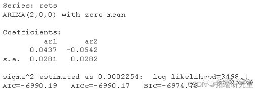 rt=0.0437∗rt−1−0.0542∗rt−2+ϵt 其中 ϵt 是白噪声