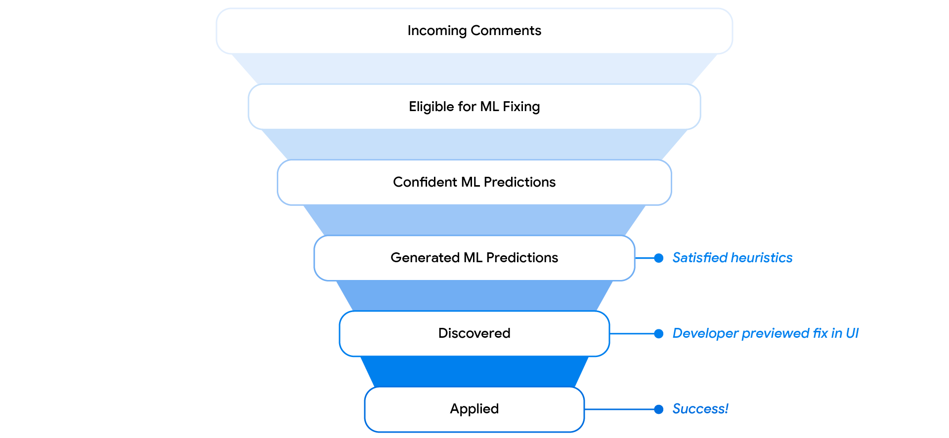 在测试版期间,我们利用 “没有帮助(not helpful)” 的反馈来识别模型的常见失败模式。我们实施了服务时间启发式规则来过滤这些,并因此减少了显示的错误预测的数量。通过这些更改,我们用质量换取了数量,并观察到现实世界接受率的增加。我们的测试版推出显示出一个潜在的问题:代码作者只预览了约所有生成的建议编辑的 20%。我们优化了用户体验,在审查员评论旁边引入了一个显眼的 “显示 ML 编辑(Show ML-edit)” 按钮(参见上图),在发布时的总预览率约提升到了 40%。我们还发现,由于作者在审查过程中进行了冲突的更改,代码审查工具中的建议编辑经常不适用。我们用一个按钮解决了这个问题,这个按钮在代码审查工具中打开了一个合并视图,用于建议的编辑。我们现在观察到,这些中有超过 70% 的在代码审查工具中应用,不到 30% 的在 IDE 中应用。所有这些改变使我们能够将采用 ML 建议编辑解决的审查员评论的总体比例增加了两倍,从测试版到完全内部发布。在 Google 可以帮助我们每年自动解决几十万条评论。