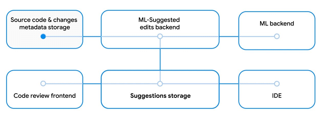 ML 建议编辑(ML-suggested edits)基础设施的架构。我们处理来自多个服务的代码和基础设施,获取模型预测并在代码审查工具和 IDE 中显示预测结果。