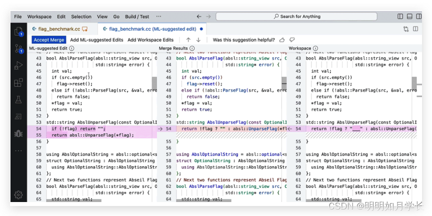 开发者在代码审查工具和 IDE 中与 ML 建议的编辑进行交互。根据用户研究的洞察,集成到代码审查工具中最适合于流线型的审查体验。IDE 集成提供了额外的功能,并支持在审查过的代码状态(右图)上有冲突的本地更改情况下,对 ML 建议的编辑(左图)进行三方合并,合并到合并结果(中图)。
