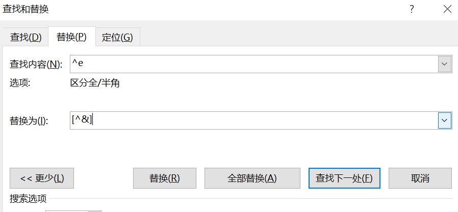 这时查找内容选项中已经填写为e,将替换为输入[&],点击全部替换