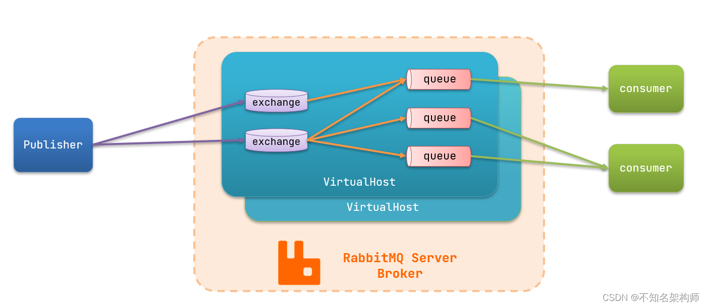 :虚拟主机,隔离不同租户的exchange、queue、消息的隔离