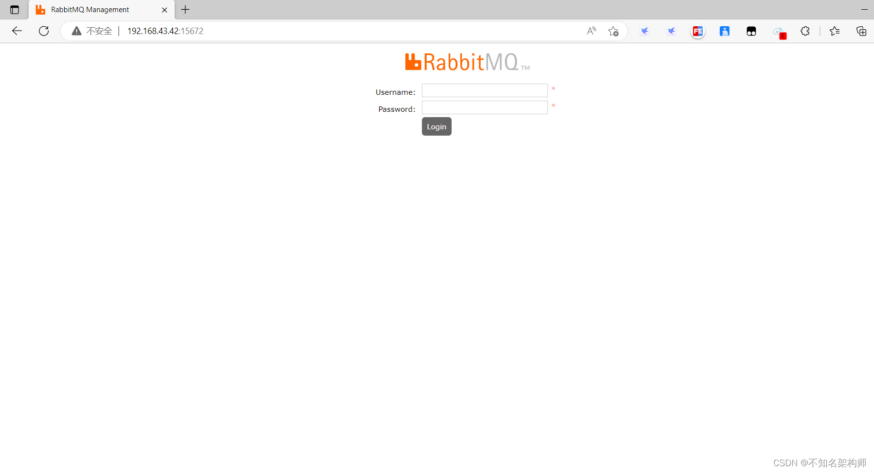 然后我们就可以直接通过 http://IP地址:15672 就可以访问远程的web管理界面。这时还是没办法进行登陆的,即使使用默认的用户和密码也无法登陆,可以执行以下流程实现登陆。