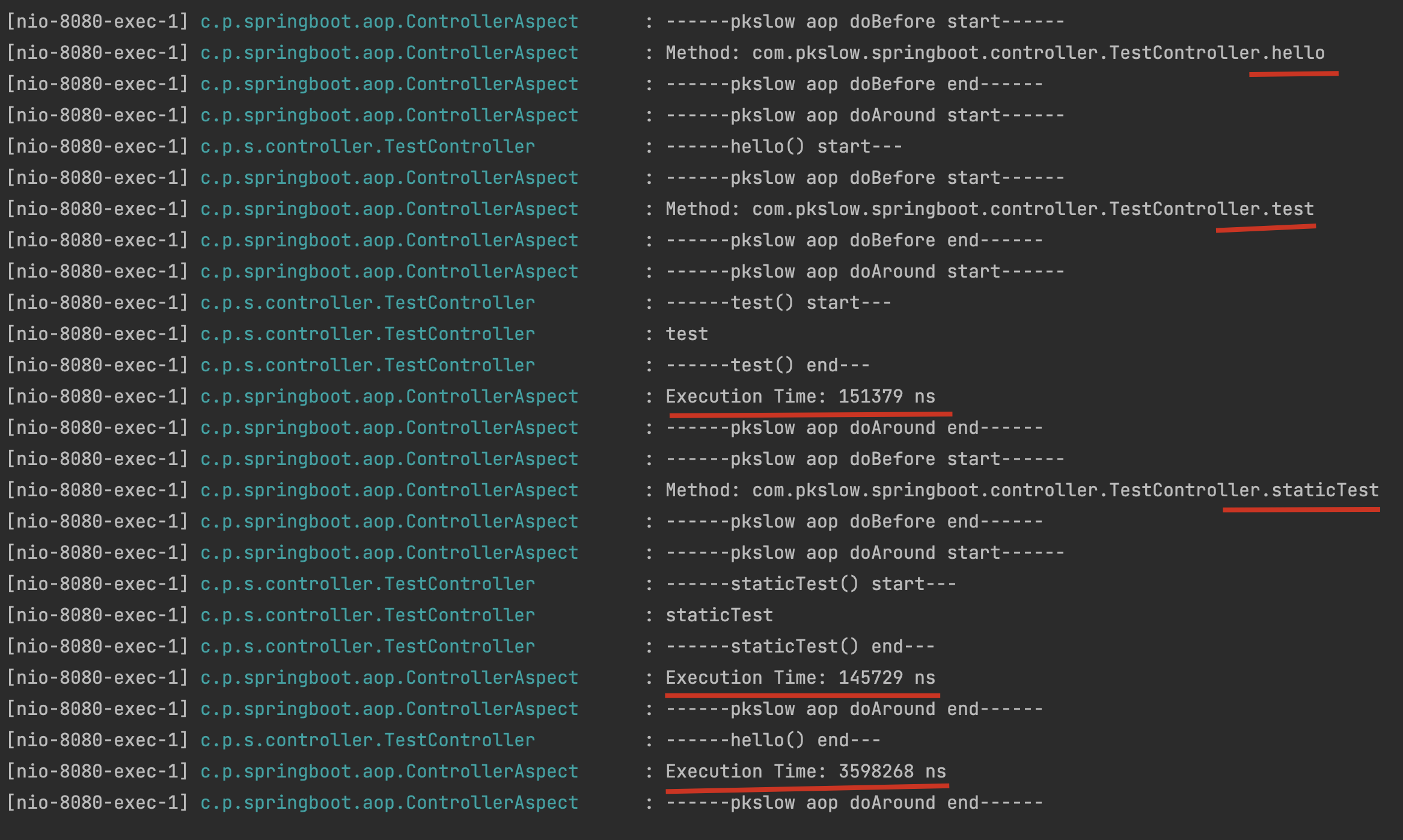 [INFO] Join point 'method-execution(void com.pkslow.springboot.controller.TestController.staticTest())' in Type 'com.pkslow.springboot.controller.TestController' (TestController.java:28) advised by around advice from 'com.pkslow.springboot.aop.ControllerAspect' (ControllerAspect.class(from ControllerAspect.java))