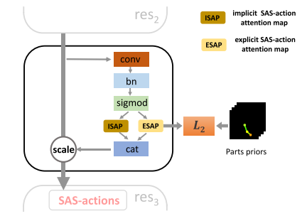 在原有网络中,做了 修改:(1)添加了PAM模块,从而帮助模型学习SAS动作,结构图如下图: