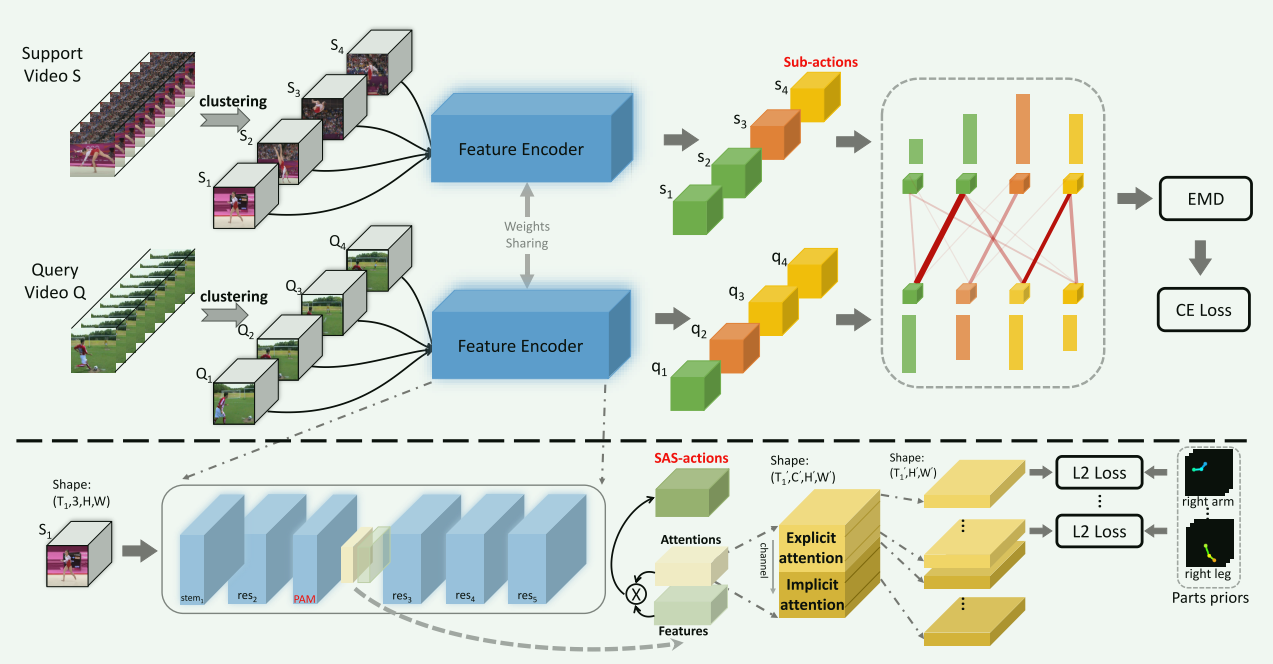 (1)提出了分层表示的细粒度子动作和SAS动作组件,这能够学习新动作和基础动作之间更多的共同模式; (2)设计了部件注意模块(PAM),以关注各种感兴趣的区域,特别是,明确的SAS行动包含预定义的人体部位和隐含的SAS行动包含其他行动相关的线索,如上下文。 (3)为了更好地比较细粒度的模式,采用地球移动器的距离作为距离度量的几杆动作识别处理时间无关的行动,它可以很好地匹配这些细粒度和歧视性的子动作表示。 (4)大量的实验表明,所提方法在HMDB51,UCF101和Kinetics数据集上取得了最先进的结果。