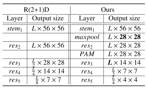 该方法将视频动作进行了两次划分:第一次是根据人通常将动作分解来识别动作的原理,将复杂动作划分为多个子动作;第二次是沿着空间维度,将子动作划分为细粒度的SAS动作。经过两次划分后可以实现基本动作(训练)与新动作(测试)之间的信息传递。网络使用的是Efficient R(2+1)D网络,其结构如下表: