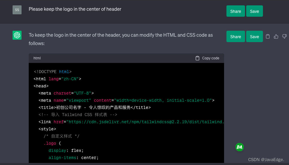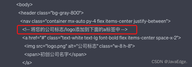 发出增加 logo 的请求后,ChatGPT 会在 header 标签中增加一个 img 标签,即在网页中插入一张 logo 图片,img 标签的 src 属性值,默认为 logo.png,替换为我们想用的网站 logo。