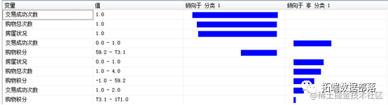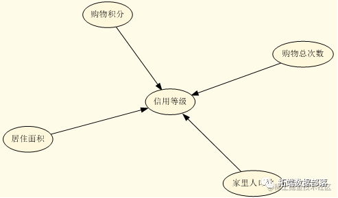 然后可以看到依赖网络。依赖网络图是指预测变量和其他变量直接的依赖性。从图中可以看到在用户属性中,几个属性会影响信用等级,包括购物积分、次数、居住面积以及人口数量。
