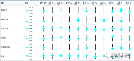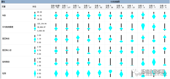 从聚类结果可以看到,聚类将所有用户分成了10个信用级别。