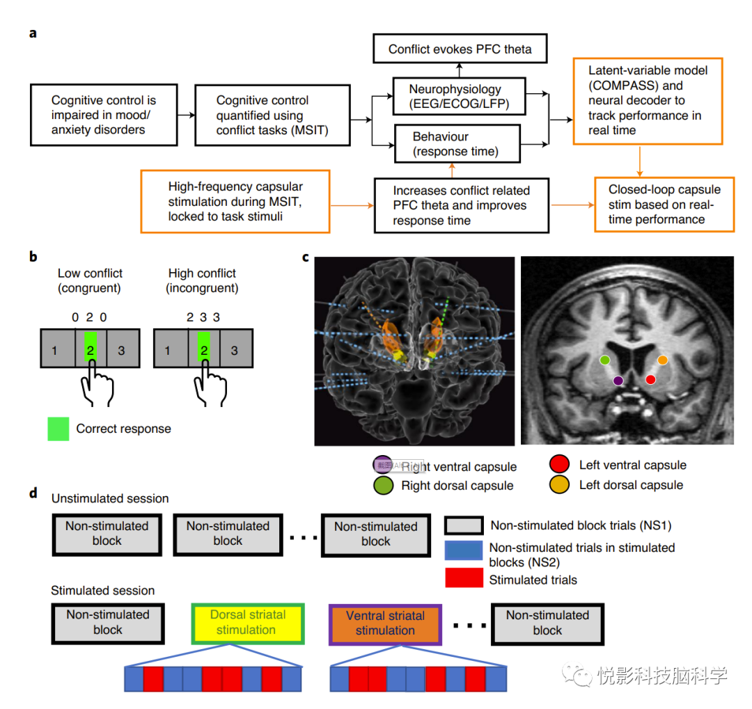 在目标改变时灵活地改变策略或反应风格的能力。首先,认知控制缺陷在精神障碍中很常见,包括抑郁症、成瘾症、精神分裂症和强迫症。它们与情绪和焦虑障碍尤其相关,在这些障碍中,患者往往无法脱离习惯性的、由痛苦驱动的行为。第二,使用认知冲突任务,控制的关键方面很容易测量。在这些任务中,较慢的反应时间意味着难以施加控制来克服反应冲突,以至于在这些任务中的表现是最常用的临床和实验室认知对照指标。第三,控制和冲突都有一个可能的电路衬板。面对竞争选择时的行动选择与前额叶皮层(PFC)的多个亚区域和纹状体中的对应区域之间的相互作用有关。它们同样有一个生理标记:许多不同的冲突任务唤起了强大的电生理特征,即PFC中的theta(4-8Hz)振荡和额叶和皮层下结构之间的低频同步。第四,该电路基底非常适合通过大脑刺激来进行操作。PFC、纹状体和基底神经节由白质束紧密相连,白质束主要在内囊。这些束遵循相对刻板的轨迹,这意味着在特定的荚膜部位的刺激可能会在个体之间产生类似的回路。在这一点上,对内囊和丘脑底核的深部脑刺激(DBS),以及对外侧PFC的经颅电流刺激,都能提高认知控制任务的表现。换句话说,如果这些不同的发现可以被整合起来,那么直接补救认知控制缺陷就存在科学基础。