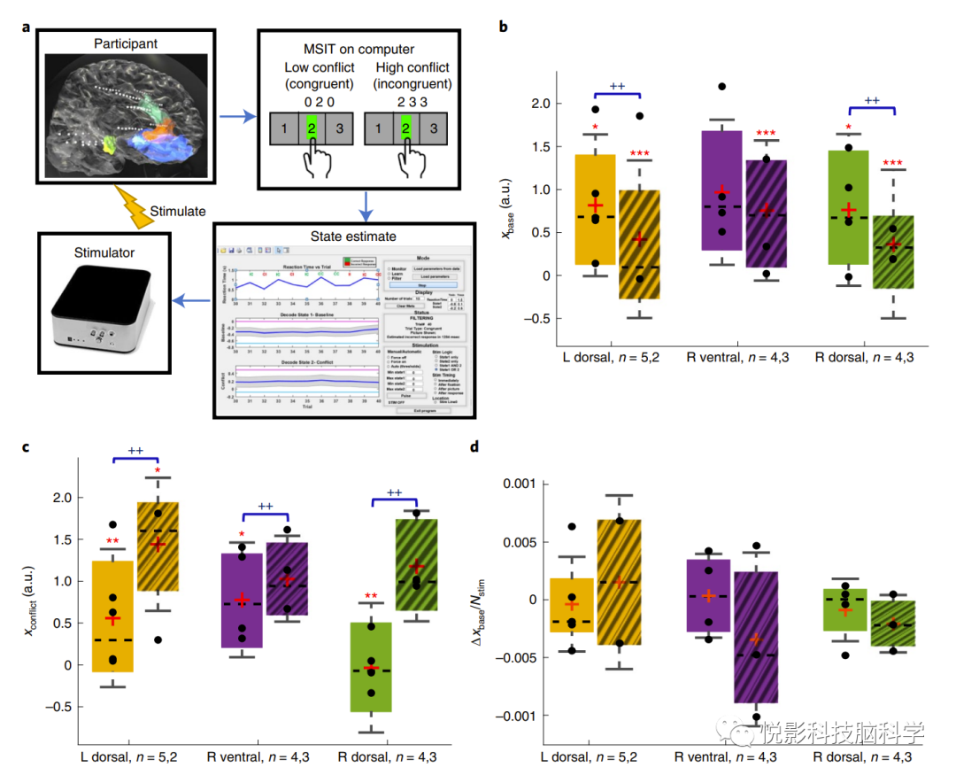 图4. 闭环内囊刺激可有效增强认知控制能力。a,闭环范式的示意图。简单地说,参与者用100个+电极记录LFP(左上)在台式电脑上进行了MSIT(右上)。一个基于MATLAB(右下角)的实时状态估计器计算了每次试验后的xbase和xconflict。这个估计器包括一个基于阈值的控制器,如果状态高于一个预先确定的阈值,则在下一次试验中触发来自神经刺激器(左下角)的刺激。实时状态估计数显示在一个基于MATLAB的GUI上。b,开环刺激(实心条)与闭环刺激(虚线条)对xbase的影响。在内囊的背侧位置,闭环刺激在减少xbase方面更有效(提高任务表现,***P< 0.001)。c,开环刺激与闭环刺激对xconflict的影响。以xbase为条件的刺激并没有减少xconflict,事实上,它在多个部位显著增加了xconflict(***P< 0.001)。d,比较xbase(Δxbase)(0表示NS1没有变化)除以刺激试验次数(Nstim)。负值表示由block水平上的特定刺激引起的xbase的减少(期望)。b和c中的状态值被归一化,因此在两个实验中,非刺激block的每个参与者的平均状态值为1,允许在参与者之间进行比较。显著性是通过置换检验来确定的,给定了高度自相关的数据。P值(相对于无刺激:*P< 0.05,**P< 0.01,***P<0.001,P<0.001;与开环刺激:++P< 0.001)。每个实验的被试数量(n)在X轴上指定为开环和闭环参与者。数据点代表个体参与者,条形图表示中位数(虚线),条形图表示最大值/最小值分别对应第75和第25百分位数。
