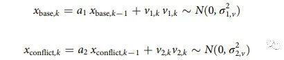 其中,yRT,k是试验k上的RT,xk是潜在的,未被观察到的变量,我们之前称之为“认知状态”。xbase,k表示没有冲突或其他外部影响因素时的预期RT,而xconflict,k表示冲突对RT的预期影响。Iconflict,k是一个指标变量,xconflict,k只影响高冲突试验的预期RT。观察噪声,εk将捕获其他影响试验到试验RT的非结构化过程。该噪声为高斯分布,平均e_k和方差sigma_squared_eps。请注意,该模型遵循与上述静态GLME相同的分布或链接假设,即对数正态分布。这种建模方法和经典卡尔曼滤波器的区别之一是RT明显是非高斯的。它只能有正的值,并且是非常倾斜的-RT分布在一系列的认知任务中都有很长的右偏态。对数正态值的假设纠正了这一点。潜在变量被建模为: