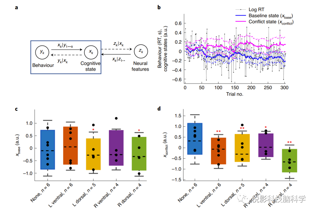 图3.内囊刺激对认知控制的影响。a,建模框架的示意图,其中行为和神经生理学通过一个低维的潜在状态空间联系在一起。这里我们关注于从行为推断潜在状态(蓝框)。b,参与者的原始行为(RT)及其分解为xbase和xconflict的例子。c,开环、随机交错刺激对xbase(预期RT)的影响。只有背侧刺激显著改善了这一任务成分(P= 0.026)。d,相同刺激对xconflict的影响(高冲突试验)。所有内囊部位的刺激改变了认知控制的这一方面(R腹侧:P= 0.02,休息:P< 0.001)。每种刺激类型的受试者数量(n)在X轴上指定。在c和d中,在使用FDR进行多次比较校正后,报告了P值(*P< 0.05,**P< 0.001)。由于高度自相关的状态变量,统计推断是通过非参数排列进行的(见方法)。数据点代表个体参与者,条形图表示中位数(虚线),条形图表示最大值/最小值分别对应第75和第25百分位数;误差条显示s.e.m.