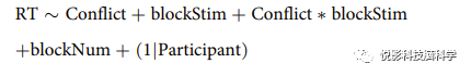 这和所有其他分析RT数据的GLMEs使用对数正态分布和身份链接函数。GLME中的固定效应是冲突(一个二进制变量,编码试验类型为低(0)或高(1)冲突)、刺激部位(blockStim)和块数(blockNum)来解释疲劳或实践效应。刺激(blockStim)在block水平上编码,即给定块中的刺激部位是背侧还是腹侧囊还是左右,而不是在给定的试验中刺激是开启还是关闭。Block水平编码对数据更简单(AIC=−449.3 block水平编码,−359.7 block水平编码)。参与者是一个随机效应。所有的分类变量都由MATLAB的“fitglme”函数自动进行虚拟编码。我们排除了回答缺失和回答不正确的试验。