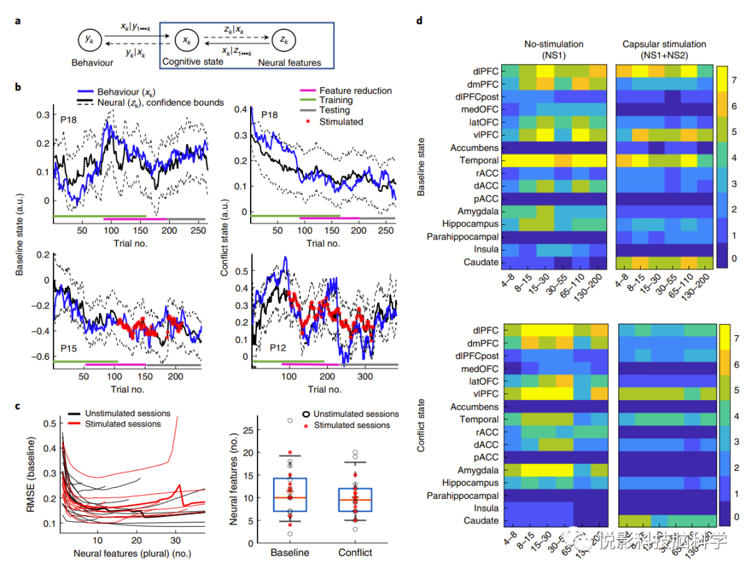 图5. 认知状态的神经解码。a,编码解码框架示意图,使用与图3(公式2)相同的状态变量。在这里,我们确定了神经特征(LFP功率)和潜在的认知状态(蓝框)之间的线性依赖关系。b,从被试P18、P15和P12的行为和神经解码中估计的基线(左)和冲突(右)状态的例子。图底部的彩色条形图表示用于训练、特征修剪(验证)和测试的数据段。在整个任务运行过程中,有很强的一致性,包括未用于训练解码模型的数据。在未受刺激(上)和受刺激(下)实验中,解码质量是相似的。c,使用特征下降分析确定的最优神经特征集(左)。细线代表个体参与者(n= 21),粗线代表平均值。开环表示使在保留的验证集上每个参与者的xbase的均方根误差(RMSE)最小的特征的数量。这个特征的数量在xbase和xconflict之间,或刺激和未刺激块之间没有差异(右)。数据点代表个体参与者,条形图表示中位数(虚线),条形图表示最大值/最小值分别对应第75和第25百分位数,在非刺激(左,NS1)和间歇性荚膜刺激(右,NS1+NS2)阻滞期间,在不同的脑区和频带编码xbase(上)和xconflict(下)的参与者数量。囊膜刺激将编码从皮层区域转移到皮层下,特别是尾状核。
