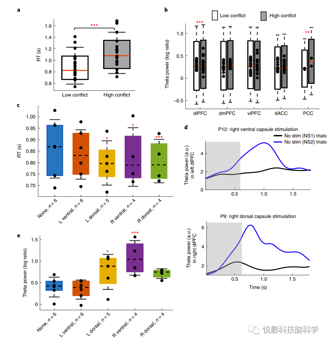 图2. 冲突和开环荚膜刺激对认知控制的影响。a,21名参与者的低冲突和高冲突非刺激试验(NS1)中的RTs显示出显著差异(P< 0.001 = 7.84×10−124,在21名参与者的单次试验水平上计算)。数据点显示了个体参与者的每种条件的平均值。b,在额叶区进行低冲突和高冲突的NS1试验中的theta功率。功率表示为相对于试验前背景的对数比。在早期的研究中,冲突减缓了dlPFC(P< 0.001)和PCC(P= 0.006)中显著升高的theta,在单个试验水平上计算的P值。数据点显示了个体参与者的每种条件的平均值。c,MSIT期间开环刺激时的RT。在a-c中,这些点代表个体参与者,条形图表示中位数(红线或黑色虚线),条形图的最大值/最小值分别对应第75和第25百分位数;误差条显示s.e.m.刺激提高了任务表现,这反映在L背侧(P= 0.015)、R腹侧(P= 0.031)和R背侧(P< 0.001)包膜刺激显著降低了RTs。颜色对应于图1c中的刺激部位,并对非刺激条件进行了推理测试。d,来自两个参与者(P9和P12)的PFC通道的功率痕迹的例子,通过右腹侧(上)和右背侧(下)被膜刺激。NS1和NS2试验如图1d所示。刺激来自090.6s(灰色窗口),尽管请注意,曲线只显示了来自非刺激试验的数据。e,与NS2试验(所有其他条件)相比,NS1试验(无)中PFC通道的任务诱发theta功率(对数比与试验前基线)。L背侧和R腹侧囊刺激显著增加了theta功率(P=0.043,P<0.001),如早期报道。每种刺激类型的被试数量(n)在X轴上指定。在所有面板中,使用FDR进行多次P比较校正后,报告P值(**P<0.01,***P< 0.001)。dlPFC、背外侧PFC、dmPFC、背内侧PFC、vlPFC、腹外侧PFC、dACC、背侧前扣带皮层;PCC、后扣带皮层。