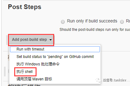 点击 Add post-build step 在弹出的选项中选择 执行 shell