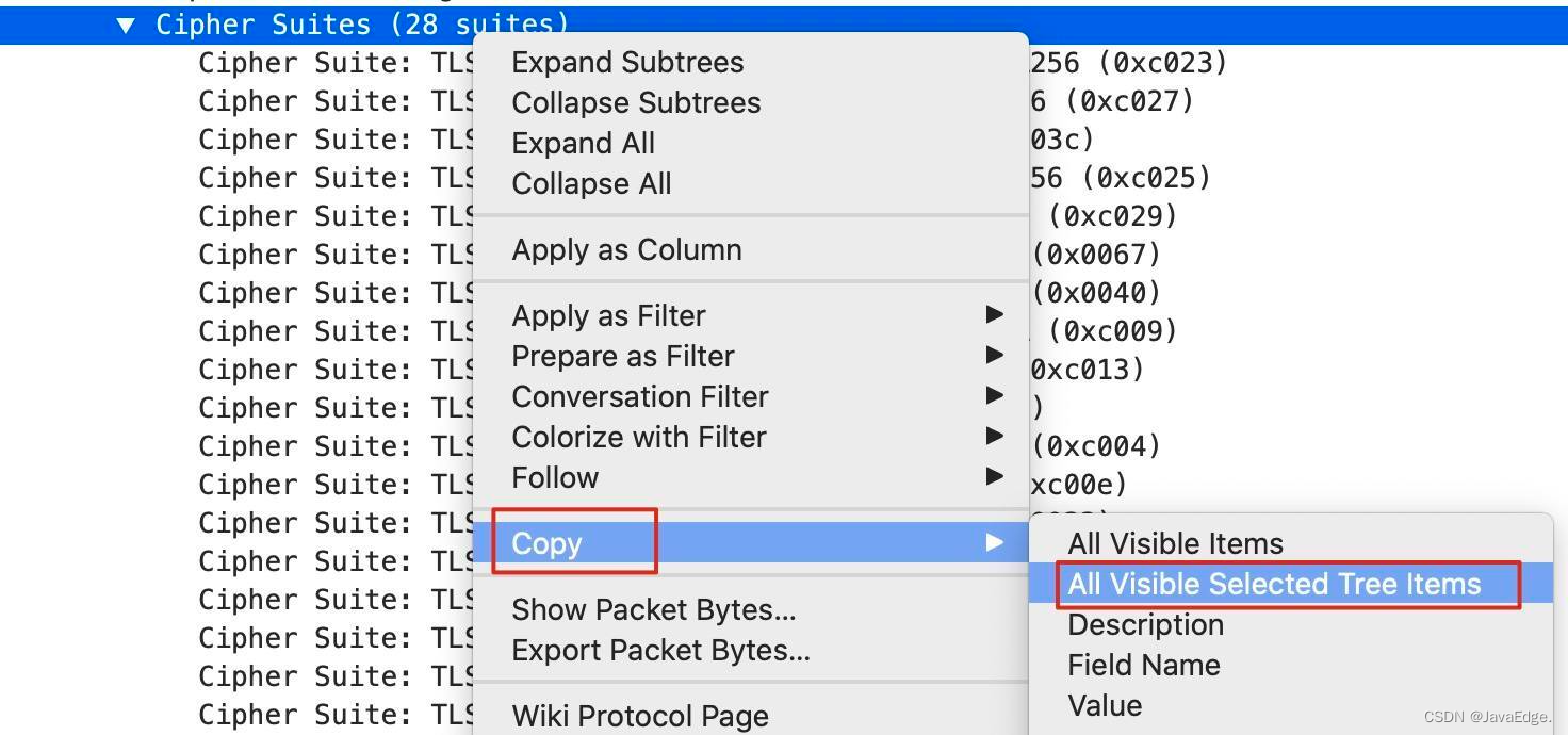 我们要导出这次Client Hello里面的密码套件列表,可以这样做:选中Cipher Suite,右单击,选中Copy,在次级菜单中选中All Visible Selected Tree Items:
