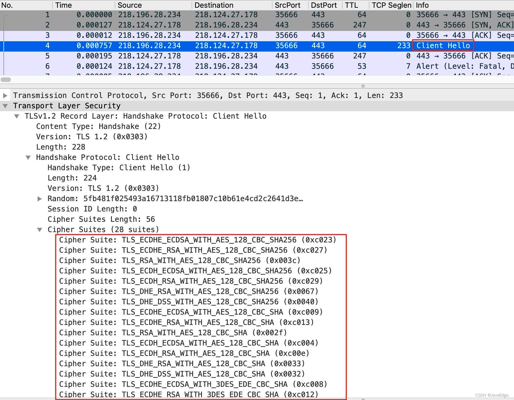 咋获得这Java库能支持的密码套件列表?最直接的, 抓包分析。回到前面那抓包文件,检查Client Hello报文。在那就有Java库支持的密码套件列表: