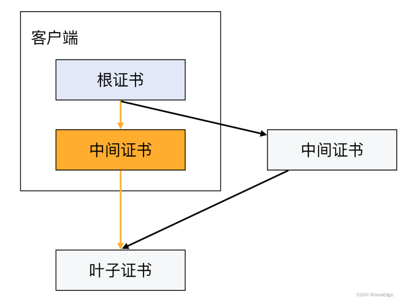 TLS证书验证是“链式”机制。如客户端存有根证书和它签发的中间证书,那由中间证书签发的叶子证书,就可被客户端信任了,也就是这样一条信任链: