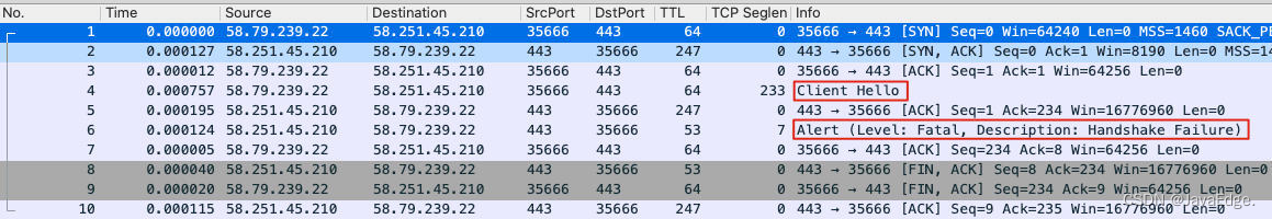 “话不投机半句多”,客户端就发个Client Hello报文,服务端就回复TLS Alert报文,结束这次对话。