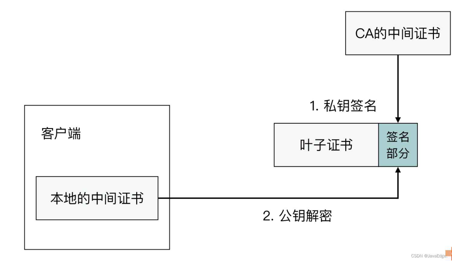 TLS证书都有签名部分,这签名就是用签发者的私钥加密的。客户端为啥相信叶子证书真的是这CA签发的?因为客户端的Trust store里就有这CA的公钥(在CA证书里),它用这公钥去尝试解开签名,能成功,就说明这张叶子证书确是这CA签发。