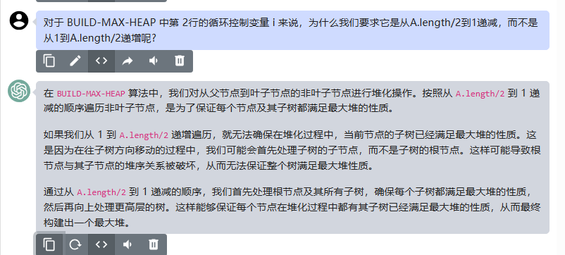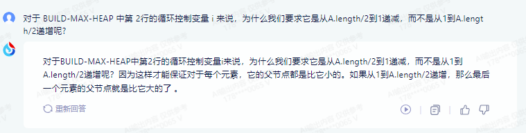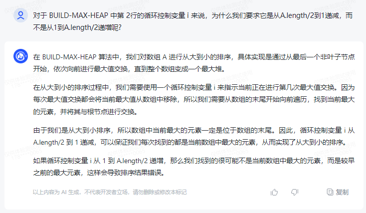 因此,为了每次都能够将当前节点的较大孩子与其兄弟节点进行比较,并确保堆的性质,我们使用了从 A.length/2 到 1 递减的循环控制变量 i。这样,每次我们将较大孩子与其兄弟节点进行比较,就可以确保当前节点比其孩子中的最大值小。