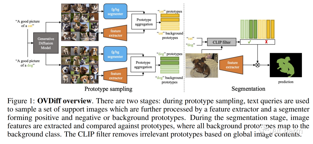 现实世界中的对象种类几乎是无限的,因此不可能使用在一组固定类别上训练的模型来捕捉。因此,近年来,开放式词汇表方法引起了社区的兴趣。本文提出了一种零样本开放式词汇分割的新方法。之前的工作主要依赖于使用图像-文本对的对比训练,利用分组机制来学习与语言一致且本地化良好的图像特征。然而,这可能会引入歧义,因为具有相似说明的图像的视觉外观通常会有所不同。相反,我们利用大规模文本到图像扩散模型的生成属性来对给定文本类别的一组支持图像进行采样。这为给定文本提供了外观分布,从而避免了歧义问题。我们进一步提出了一种机制,该机制考虑采样图像的上下文背景,以更好地定位对象并直接分割背景。我们表明,我们的方法可用于以自然语言为基础的几个现有的预训练自监督特征提取器,并通过映射回支持集中的区域来提供可解释的预测。我们的提议是免训练的,仅依赖预训练的组件,但在一系列开放式词汇分割基准测试中表现出色,在 Pascal VOC 基准测试中领先 10% 以上。