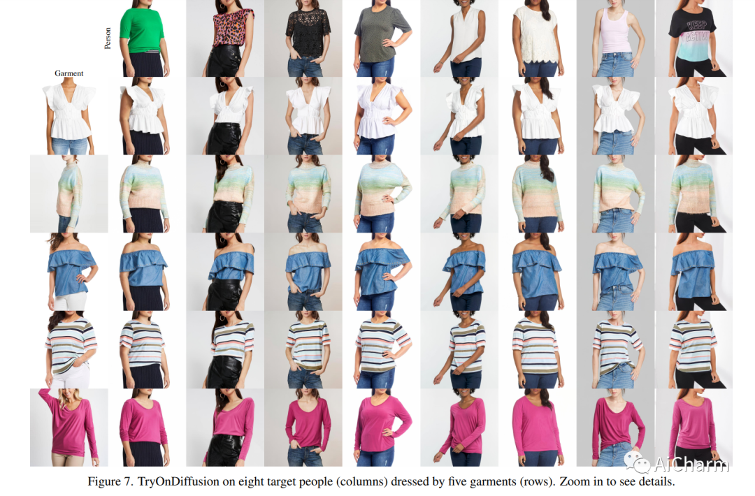 给定两张描绘一个人和另一个人穿着的衣服的图像,我们的目标是生成服装在输入人身上看起来的可视化效果。一个关键的挑战是合成服装的逼真细节保留可视化,同时扭曲服装以适应主体的重要身体姿势和形状变化。以前的方法要么侧重于保留服装细节而没有有效的姿势和形状变化,要么允许以所需的形状和姿势试穿但缺少服装细节。在本文中,我们提出了一种基于扩散的架构,它统一了两个 UNet(称为 Parallel-UNet),这使我们能够在单个网络中保留服装细节并扭曲服装以实现显着的姿势和身体变化。Parallel-UNet 背后的关键思想包括:1) 服装通过交叉注意机制隐式变形,2) 服装变形和人物融合作为统一过程的一部分发生,而不是两个独立任务的序列。实验结果表明,TryOnDiffusion 在定性和定量上都达到了最先进的性能。