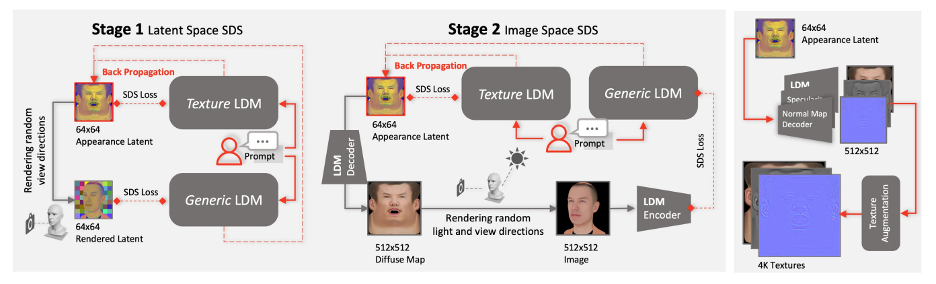 基于物理的材质扩散生成模块旨在预测与预测几何体和文本提示一致的面部纹理。DreamFace 首先将预先训练的 LDM 在收集的大规模 UV 材质数据集上微调,得到两个 LDM 扩散模型。然后,采用联合训练方案协调两个扩散过程,一个用于直接去噪 UV 纹理贴图,另一个用于监督渲染图像。