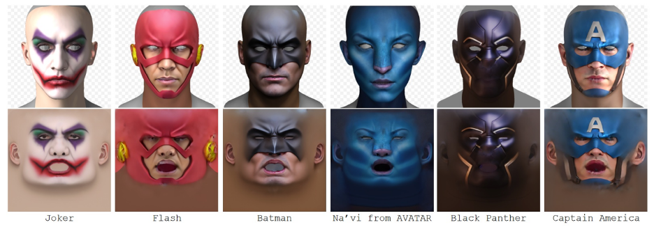 为了确保所创建的纹理地图不含有不良特征或照明情况,同时仍保持多样性,设计了一种提示学习策略。团队利用两种方法生成高质量的漫反射贴图:(1)Prompt Tuning。与手工制作的特定领域文本提示不同,DreamFace 将两个特定领域的连续文本提示 Cd 和 Cu 与相应的文本提示结合起来,这将在 U-Net 去噪器训练期间进行优化,以避免不稳定和耗时的手工撰写提示。(2)非面部区域遮罩。LDM 去噪过程将额外地受到非面部区域遮罩的限制,以确保生成的漫反射贴图不含有任何不需要的元素。