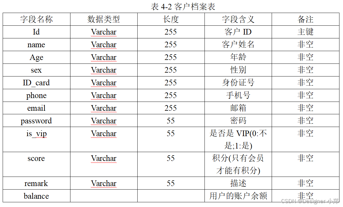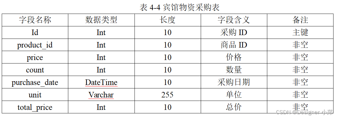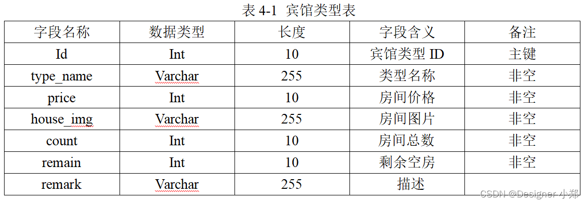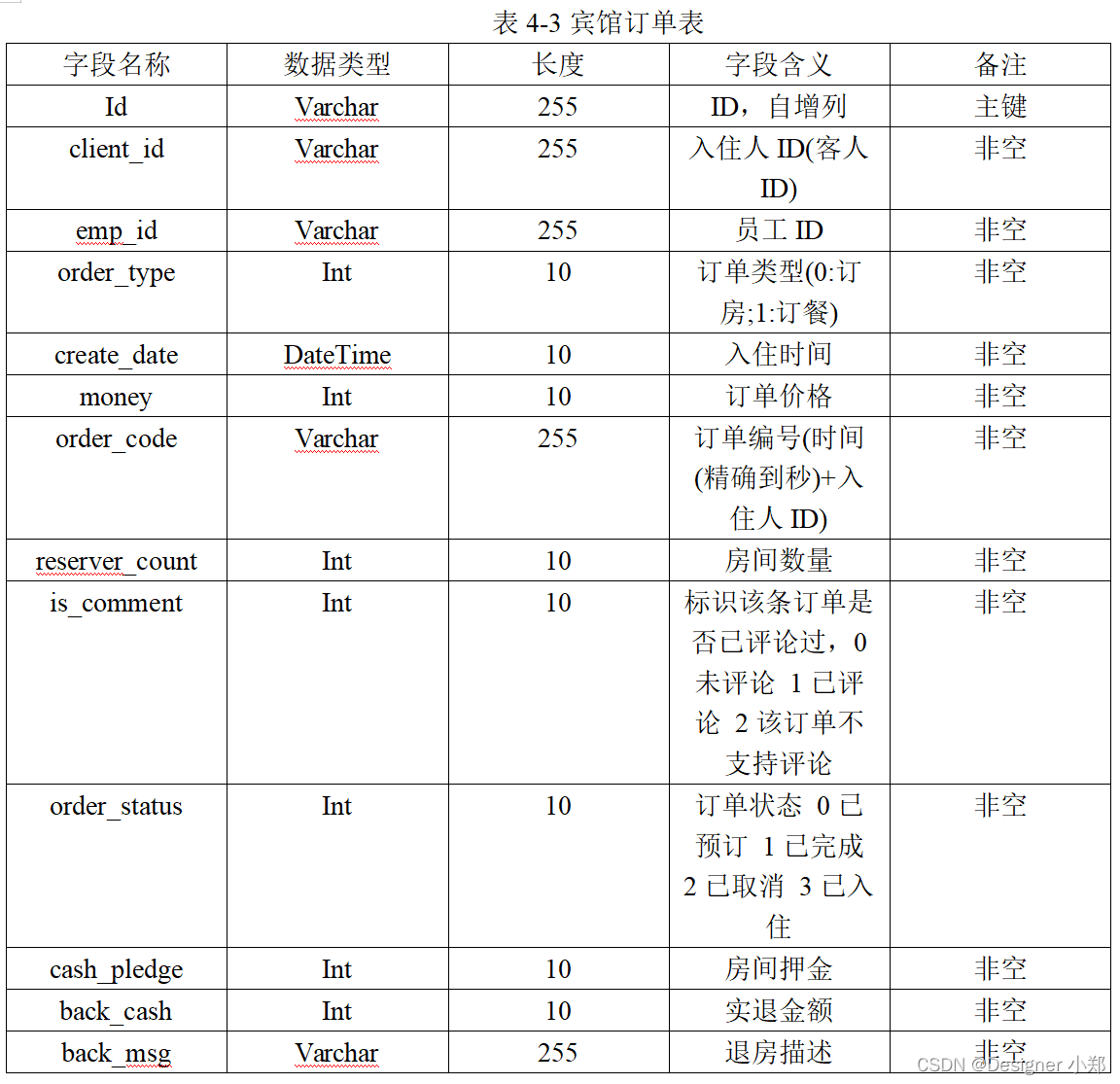 宾馆管理系统系统的宾馆类型表、客户档案表、宾馆订单表、宾馆物资采购表的设计如下表所示。