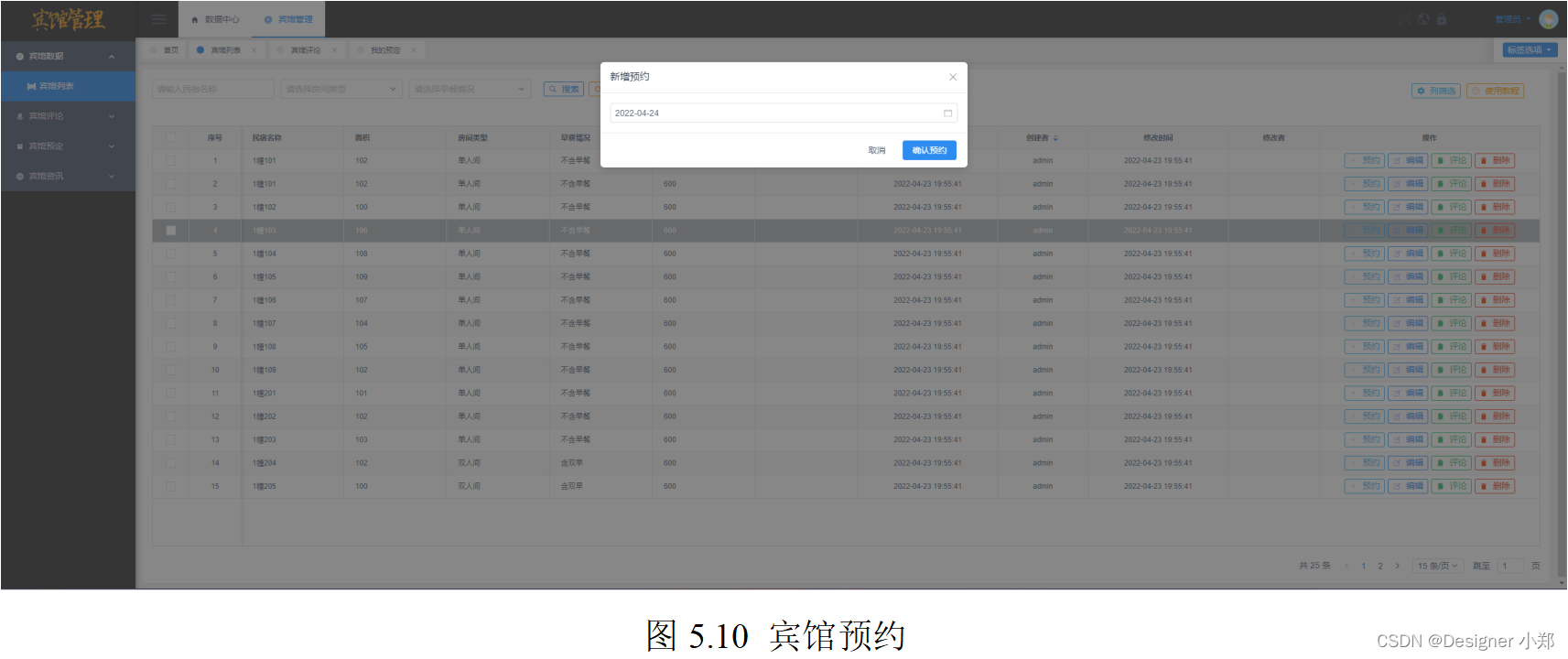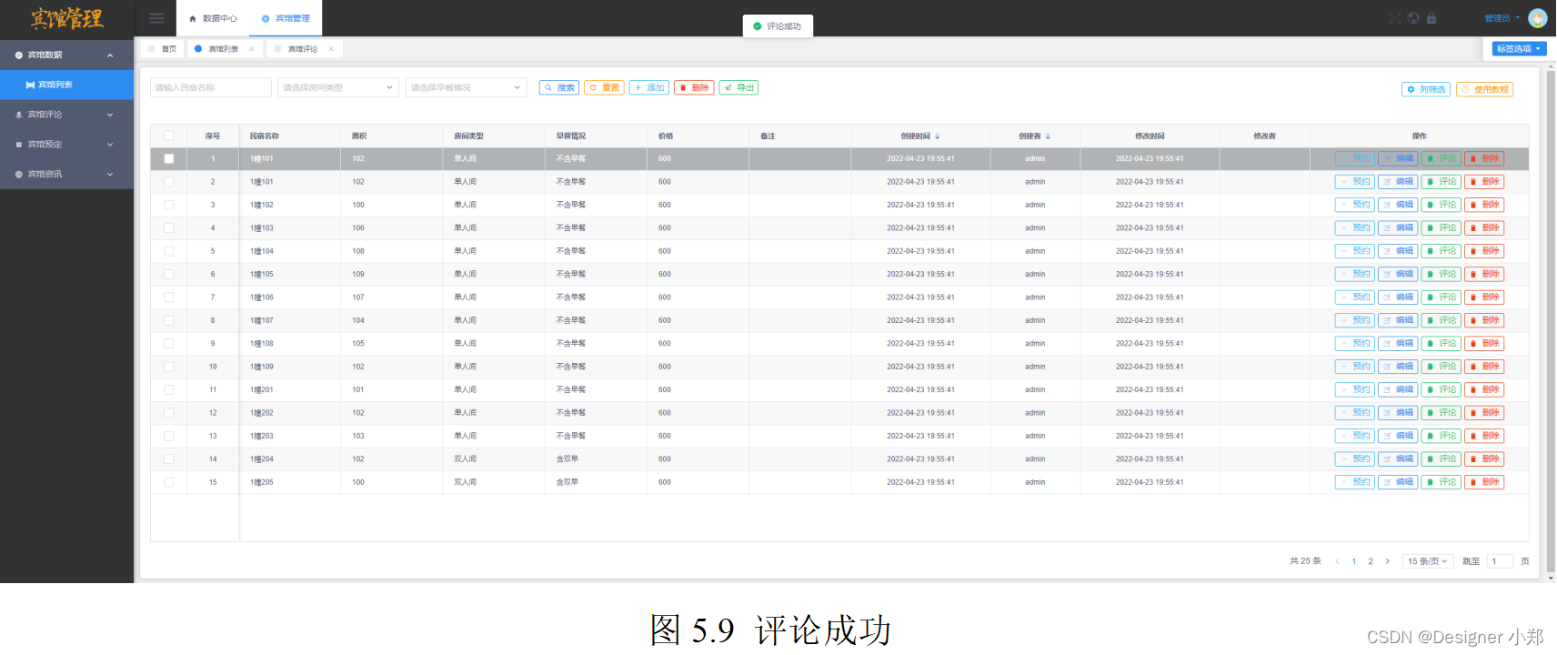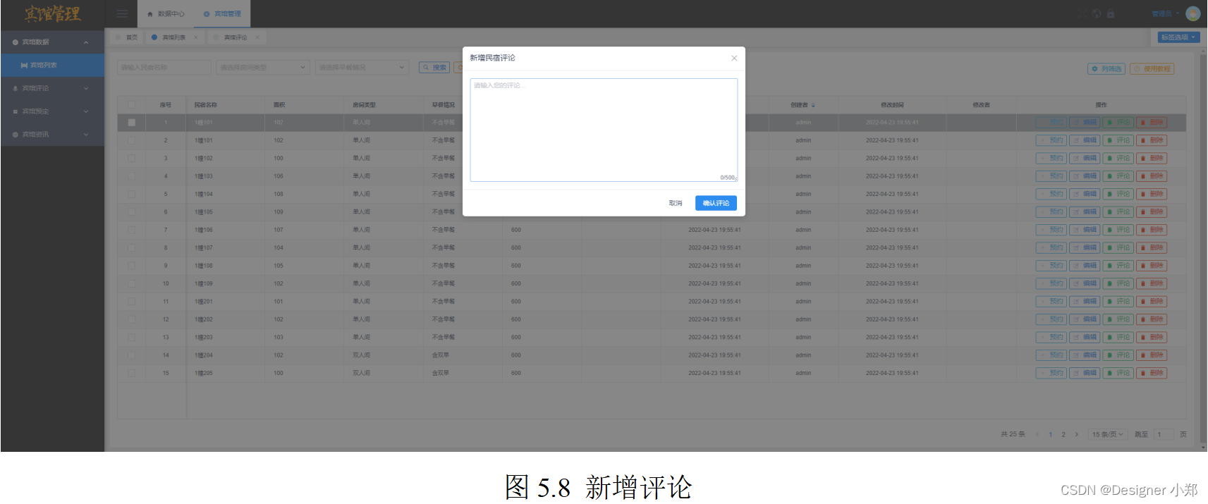 用户可以点击每一行宾馆数据的评论按钮,就会触发一个vue事件,将一个变量的值改为true,从而弹框的v-modol字段会因为数据双向绑定而显示,也就是说系统会给与弹框反馈,这样对用户交互非常友好,如图5.8所示。