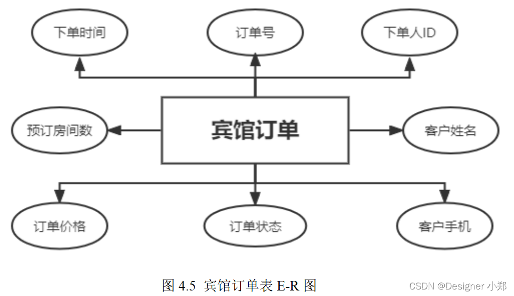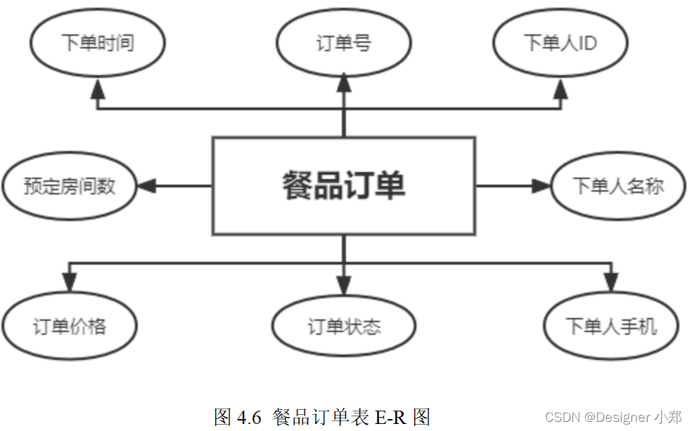 餐品订单是用于宾馆客户下的用餐订单,包括了订单号、下单人ID、下单人名称、下单人手机号、订单ID、订单价格、下单时间、预定房间数、订单状态、备注,如图4.6所示。